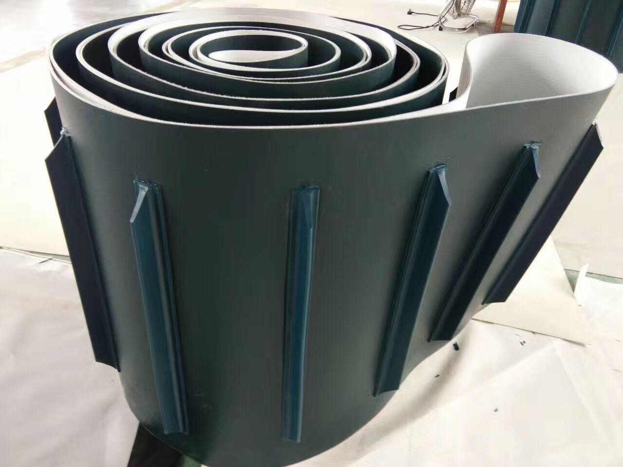 產(chǎn)品材料說(shuō)明:裙邊擋板加工說(shuō)明:輸送帶(裙邊擋板帶),擋邊起防止物料測(cè)滑撒落的作用。為便于轉(zhuǎn)彎,裙邊設(shè)計(jì)成波紋狀;橫隔板的作用是承托物料,為了實(shí)現(xiàn)大傾角輸送,采用T型TC型。檔邊和橫隔板是用二次硫化的方法與基帶連接的,具有很高的連接強(qiáng)度。用于輸送易散落的粉狀、粒狀、小塊狀、糊狀及液態(tài)狀物料。輸送帶材料:環(huán)保型材料:輸送帶的生產(chǎn)原材料,產(chǎn)品配方科學(xué)合理,符合食品衛(wèi)生標(biāo)準(zhǔn)可與食品直接接觸,色澤適度,無(wú)