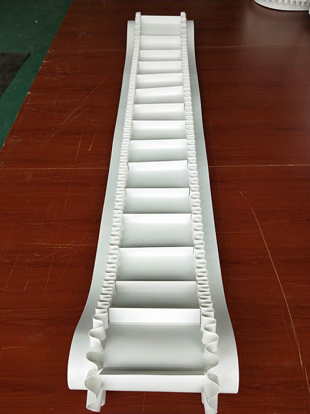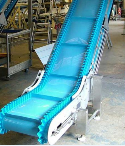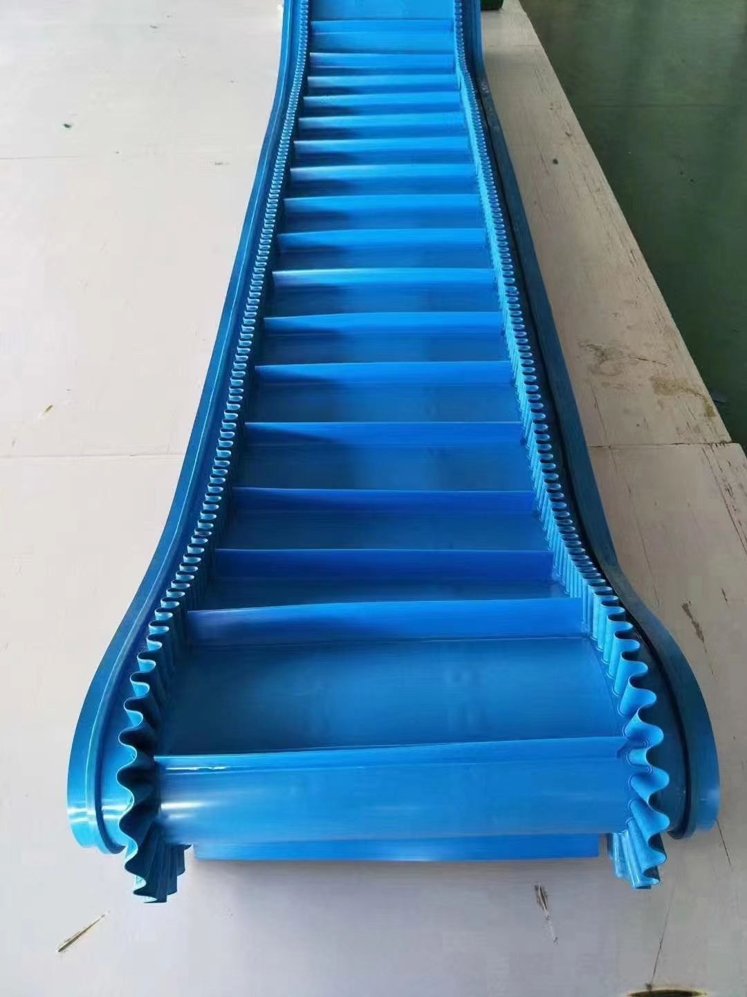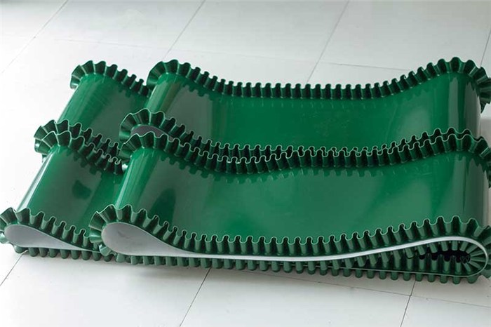 輸送帶(裙邊擋板帶),擋邊起防止物料測(cè)滑撒落的作用。為便于轉(zhuǎn)彎,裙邊設(shè)計(jì)成波紋狀;橫隔板的作用是承托物料,為了實(shí)現(xiàn)大傾角輸送,采用T型TC型。檔邊和橫隔板是用二次硫化的方法與基帶連接的,具有很高的連接強(qiáng)度。用于輸送易散落的粉狀、粒狀、小塊狀、糊狀及液態(tài)狀物料。